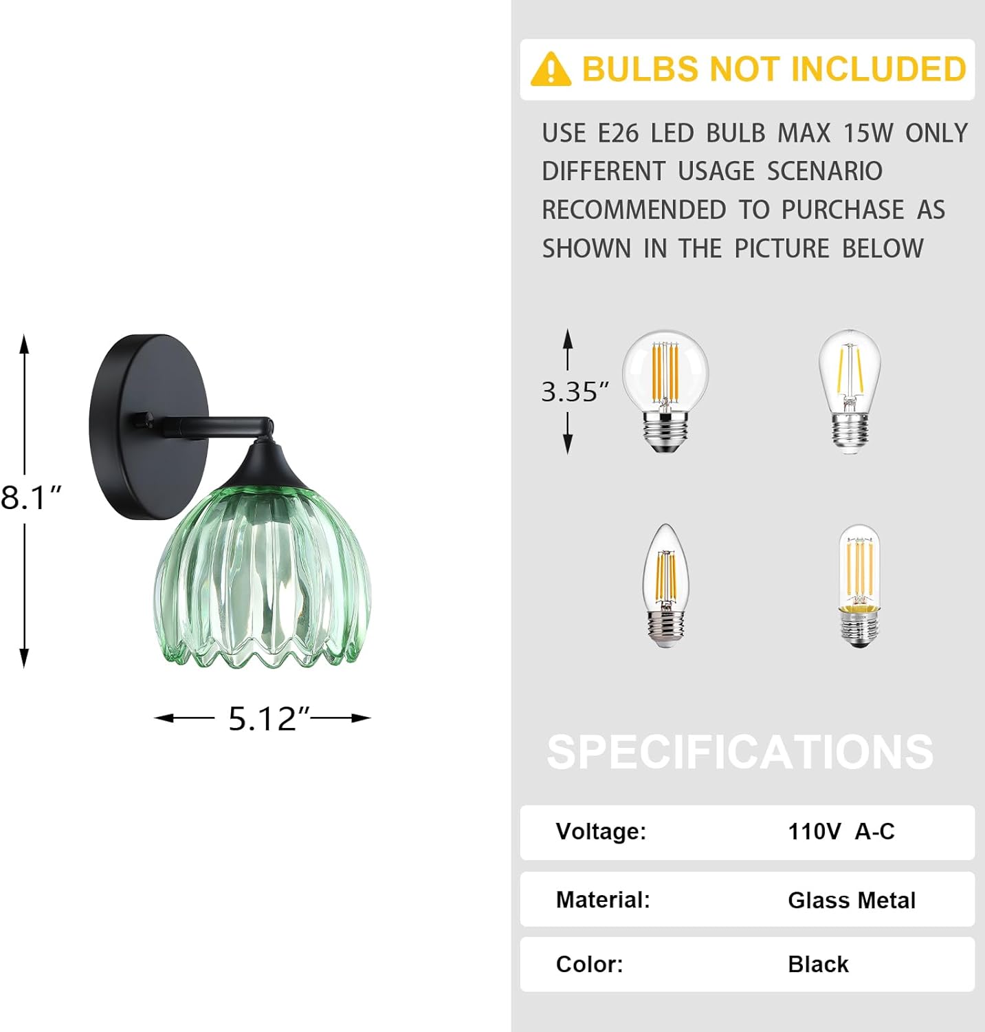 2 Pack 1 Light Vintage Wall Sconces Tulip Dark Green Glass Lampshade Hradwired Modern Black Wall Lighting Fixture for Bedside Bedroom Doorway