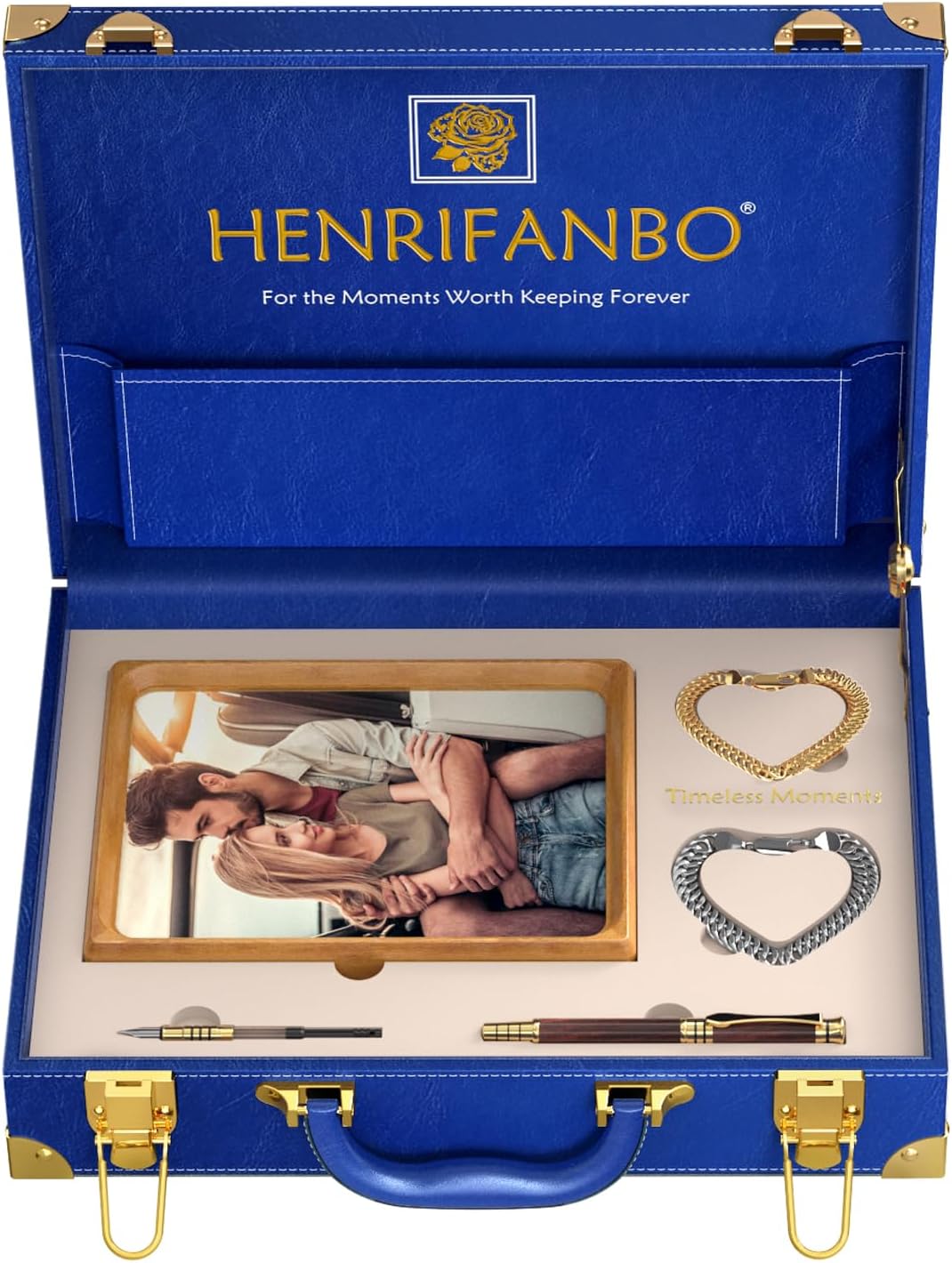 | Included Components | 6x8 & 4x6 Inch Anti-Reflective Glass Photo Frames, Couple Bracelets,Envelope Clutch Bag,Greeting Card, Elegant Travel Keepsake Leather Storage Box, Jewelry Tray, Premium Natural Wood Collectible Fountain Pen |