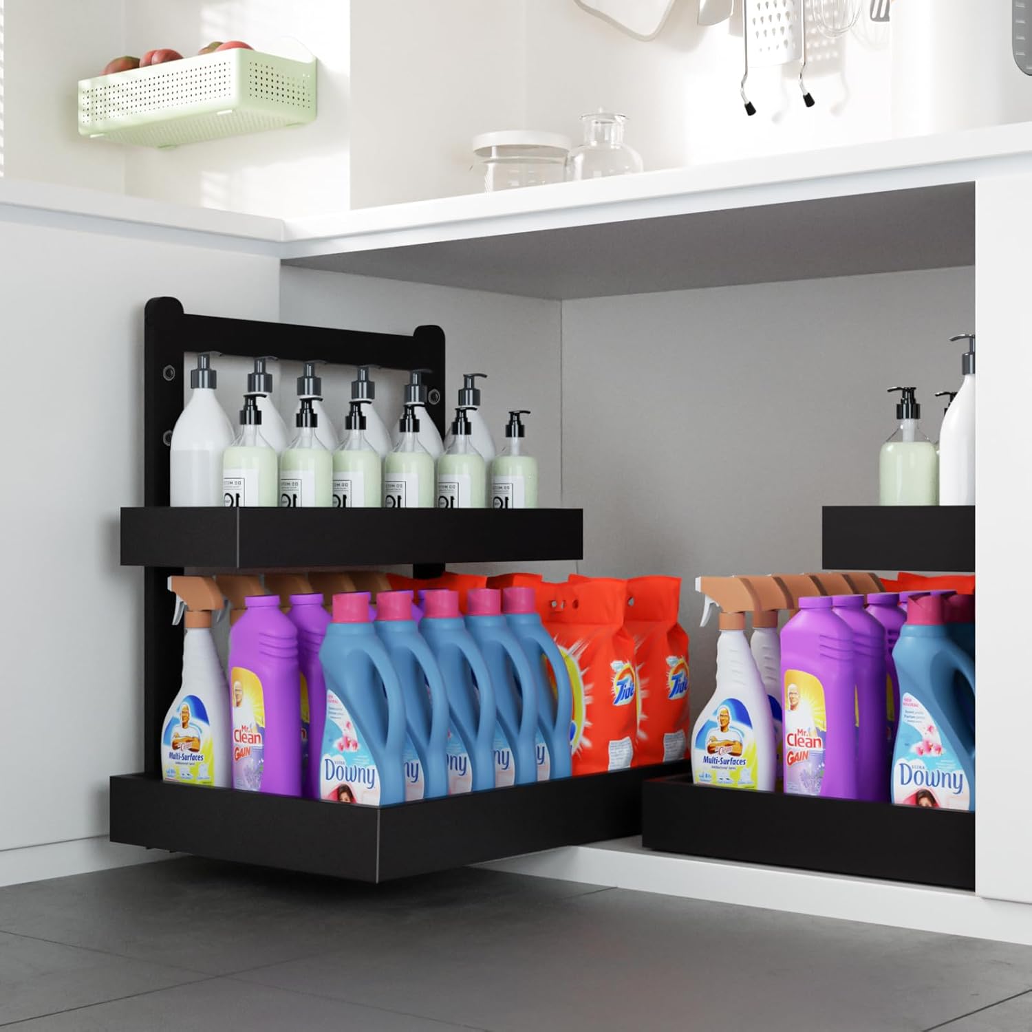 • βœ¨γ€π‹-𝐒𝐇𝐀𝐏𝐄𝐃 𝐒𝐏𝐀𝐂𝐄-π’π€π•πˆππ† πƒπ„π’πˆπ†πγ€‘Unique L-shaped design with a narrow top and wider bottom perfectly fits around plumbing, maximizing unused vertical space under the sink; The bottom tier provides ample room for tall bottles and cleaning supplies, effectively solving cabinet storage troubles
