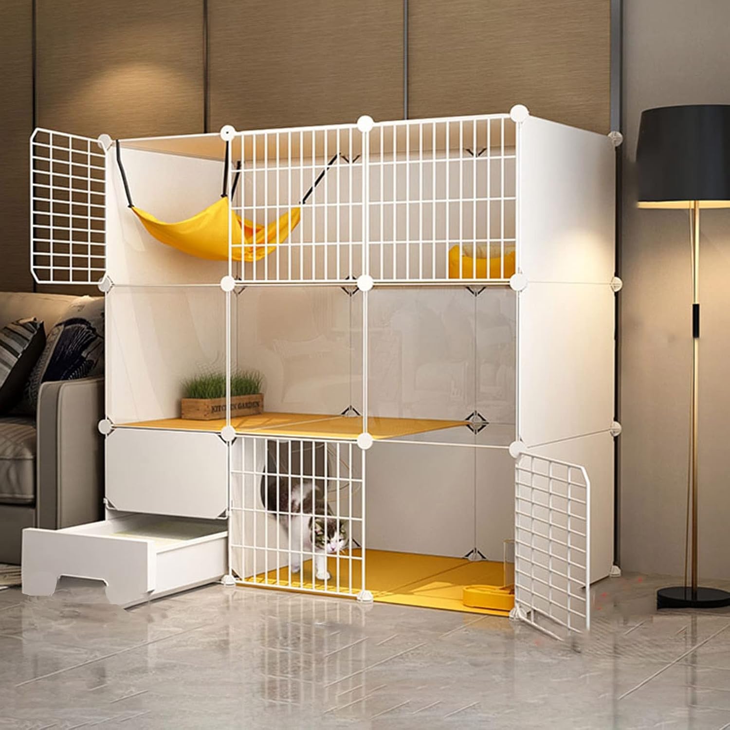 DIY pet iron net transparent fence,how to install,go out do not worry about the pet home mess was,not to worry about indoor space is not enough,not enough height,how to want to add how to add high,free splicing unlimited fun. Fun,magical,and full of possibilities,help you create a world for your pets with your own hands ·Grid design style,better ventilation and observation of your pet,thick material so that you don't feel weak without wind,you can move at will to change his position,whether indoor or outdoor,it is your good helper. Product name: DIY cat cage Colours: Black,Yellow,White Material: metal,ABS plastic Package includes: Self-contained closed cat litter box + cat litter shovel (Other accessories not included) Note: 1.Part of the paint will fall off during transportation,but it will not affect the use,please purchase with caution! 3. lf you have any questions,you can contact us by email,and we will reply within 12 hours. 100% Satisfaction Guarantee : Click the "ADD TO CART" button to order now! This product is backed up by our 100% SATISFACTION GUARANTEE and outstanding customer service for no-risk purchasing.