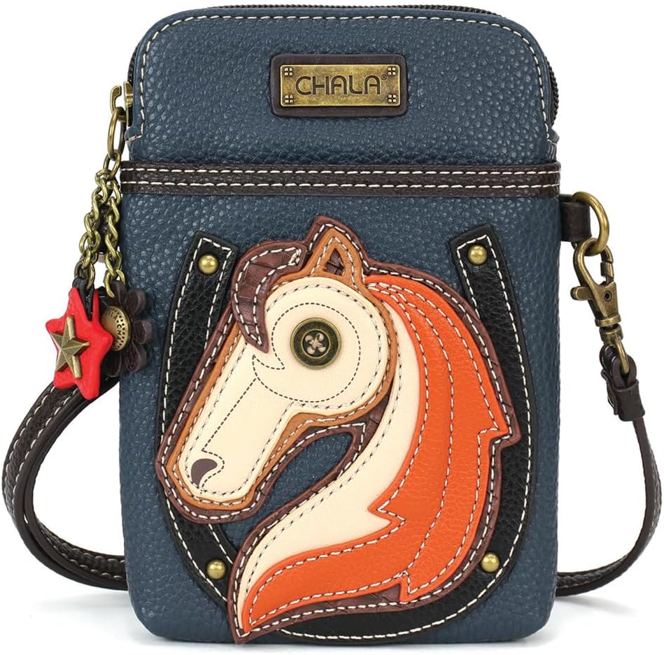 CHALA Cell Phone Crossbody Purse - elevate any on-the-go look with this handy cell phone crossbody! Made with antique bronze-toned hardware and durable vegan leather, this versatile small purse combines practical functionality and artistic flair through its meticulously crafted Chala Pal Character design featuring detailed stitching, embellishments, and playful charms. Perfect for keeping small essentials close while staying hands-free. The front slide pocket can secure small necessities, while the main zippered compartment contains 3 credit card slots along with a patterned fabric lining with extra padding to protect your cell phone. Enjoy comfortable all day wear with the 2 detachable straps that can be adjusted and worn as a crossbody, shoulder purse or wristlet. Ideal gift for nature lovers, animal enthusiasts, and anyone who appreciates functional handbags with character. Materials: Faux Leather. Dimensions: 5 inch x 7 inch x 1 inch | Strap Length: 7 inch - 32 inch. 1 year manufacturer warranty. Do not machine wash.
