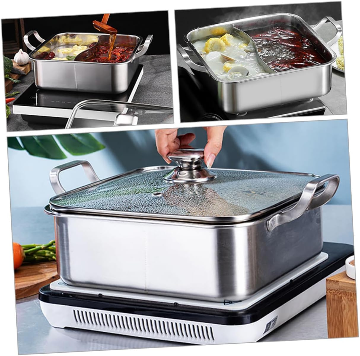 Package Include 1 x cooking pot Features -Color:Silver hotpot pot with divider -Size:26.00X26.00X9.00cm/10.22X10.22X3.54in pan with divider -Material:Stainless steel, glass hot pot induction - Hotpot Pot is a must-have product for family hot pot, with even heating and fast heat conduction chinese hot pot cooker. - This is indispensable pot for family and friends gatherings to eat hot pot stainless steel stock pot. - Hot Pot with Divider is made of stainless steel, fine workmanship the practicality and durability stainless steel cooking pot. - With fine workmanship, not easy to wear or even broken, very in use. Widely used in kitchen or home divider pan. - The inside is smooth, easy to clean, and can be reused, can be used without concern divided hot pot.Goods Descriptiondivided hot pot cooker It's suitable for family, friends gathering and hot pot restaurant.stainless steel cooking pot With this hot pot cooker, you can spend happy time with your family or friends.restaurant soup pot This is a Hotpot Pot, made of selected materials, to use.double flavor hot pot Suitable for a variety of stoves, such as gas stoves, induction cookers, electric ceramic stoves, etc