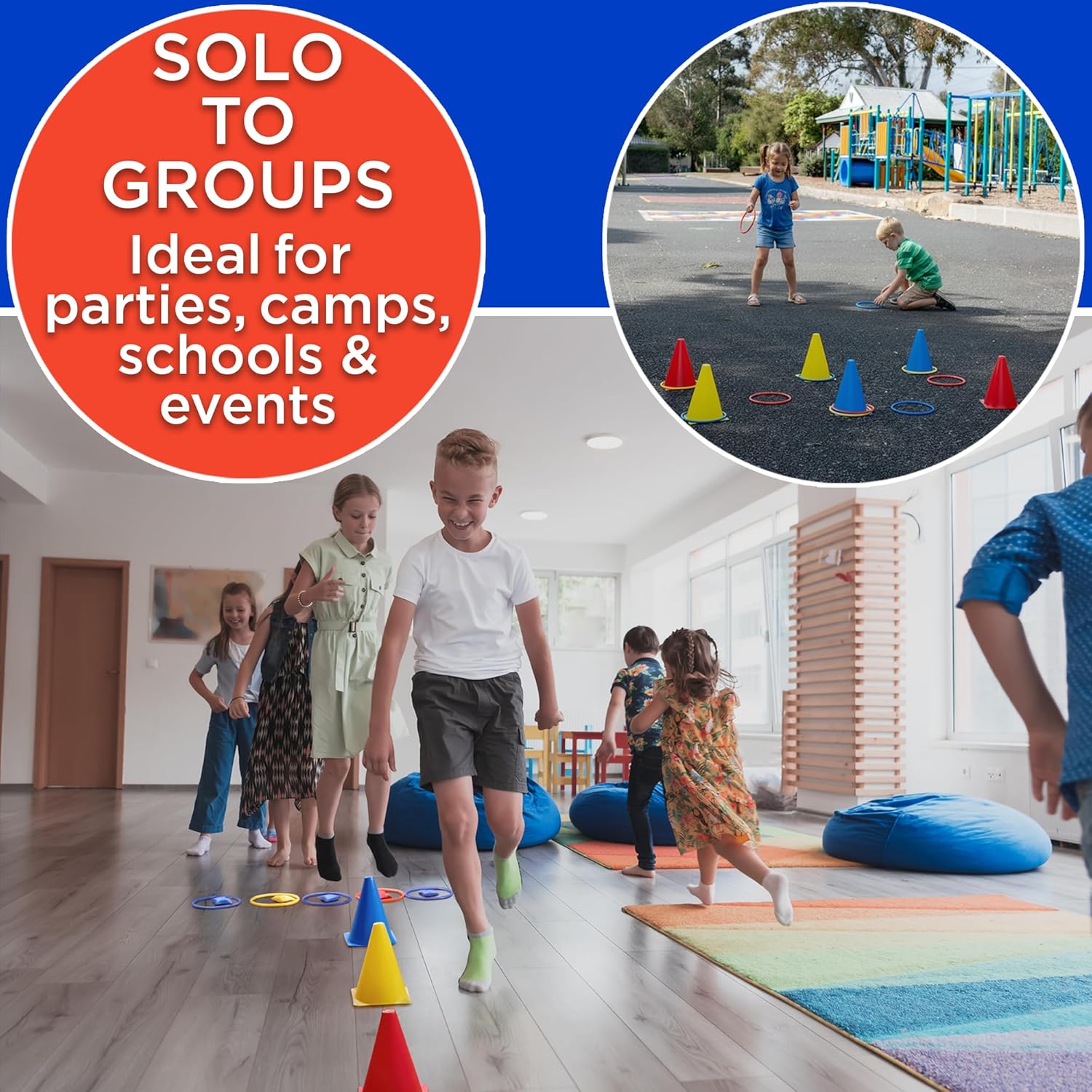 Roll Movement Dice for instant action cues, then switch to ring toss with clear, color-match scoring from the Ideas Guide. Sessions stay lively because setup is fast, rounds reset in seconds, and everything packs into a tidy drawstring bag—great for homes, schools, church halls and camps.