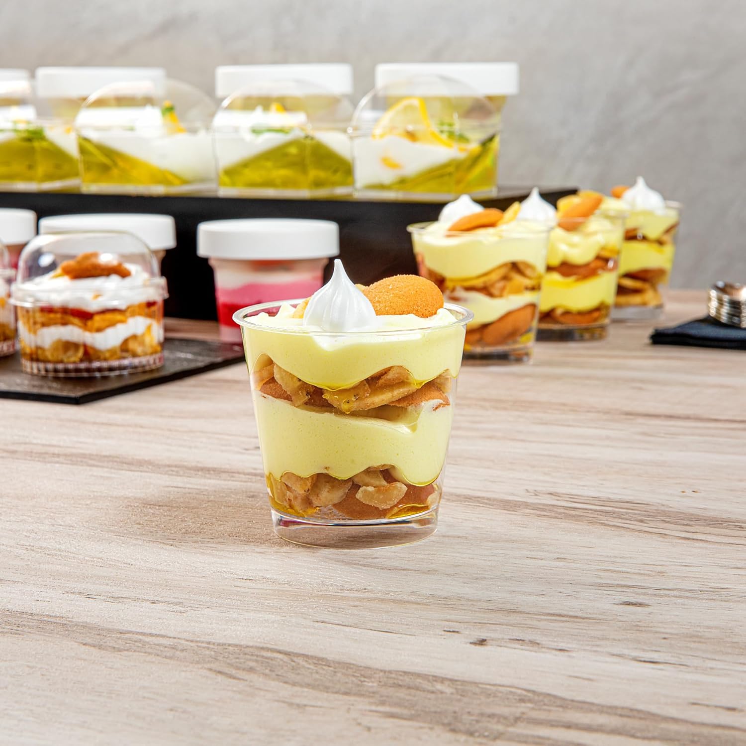 Present your desserts in style with our Mini Serve 5.7-ounce Round Clear Plastic Dessert Cups. These clear dessert cups are made from durable PS plastic, ensuring they can withstand your delicious and delicate desserts. Ideal for cold treats, these plastic dessert containers can hold everything from ice cream to fruit salad. These clear dessert cups enhance the presentation of your desserts, making them look as good as they taste. The stackable design of these plastic dessert glasses saves you valuable storage space. Being disposable, these clear dessert containers streamline clean-up time. To avert any unwanted spills, these plastic dessert cups can be paired with available lids (RWP1415C). With a capacity of 5.7 ounces, these clear plastic dessert cups are perfect for serving individual portions and measuring 3 inches in diameter by 2.8 inches in height; they're compact enough for easy transportation and storage. Sold in a 100 count box. Lids are available and sold separately.