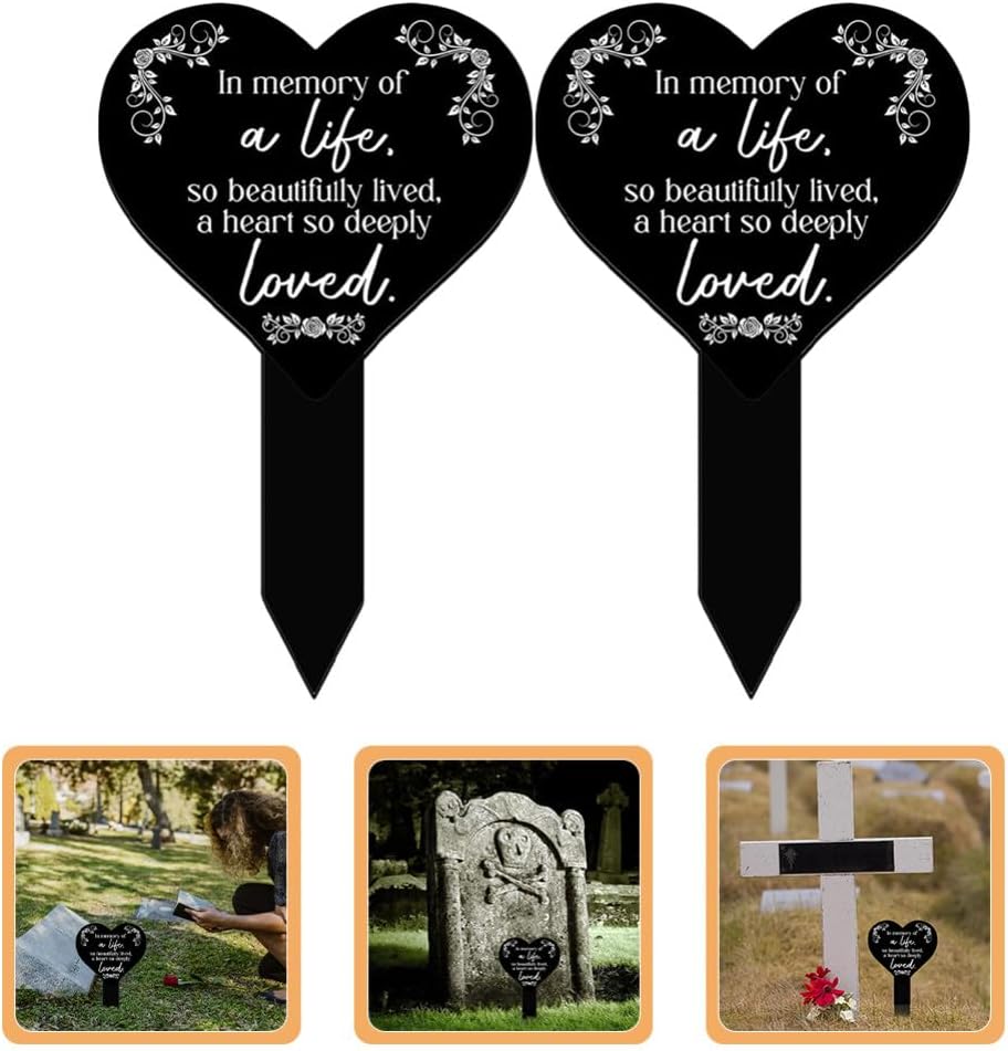 DescriptionDo you want to decorate your courtyard or cemetery? If so, our cemetery stake is carefully prepared for you. It can be used as a cemetery ornament, home decoration or a housewarming . Great decoration for outdoor use.Features-Color:Black-Material:Acrylic-Size:25.80X15.80X0.50cm/10.14X6.21X0.20in-Versatile Use: The heart marker can be used not only as a grave marker but also as a garden memorial.-Unique Plaque: The heart design is a unique and memorable way to pay attention to your loved one.-Sturdy and Durable: Made from acrylic material, the skate is designed to withstand the elements and last for years to come.-Easy Maintenance: Simply wipe clean with a damp cloth to keep the stake looking clean and new.-Suitable for All Occasions: for use at funerals, memorials, or simply as a thoughtful for those left behind.- Color: Black.- Size: 25.80X15.80X0.50CM.Package Including2 x Cemetery Heart Stakes